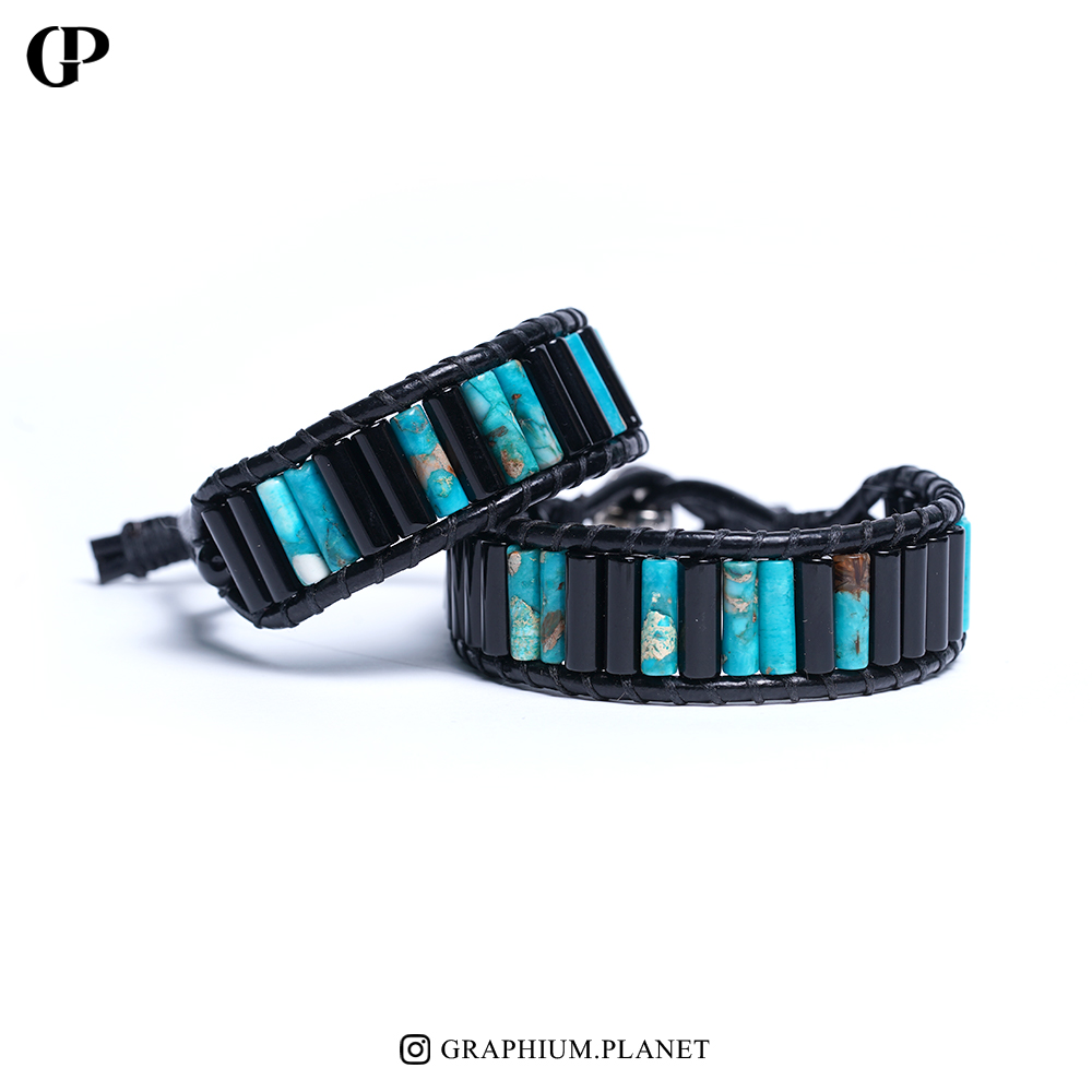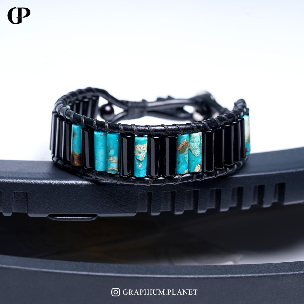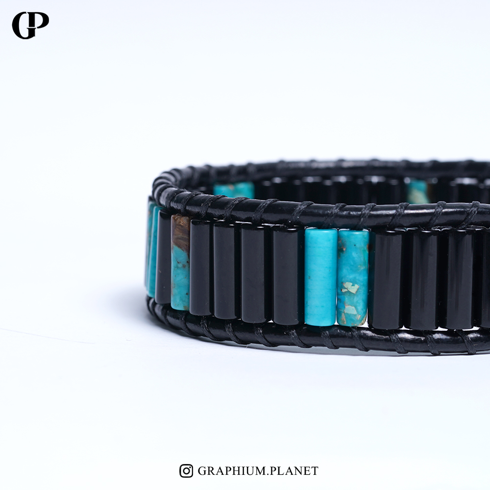 دستبند via lactea با سنگ انیکس سیاه و سنگ جاسپر فیروزه با بند چرم